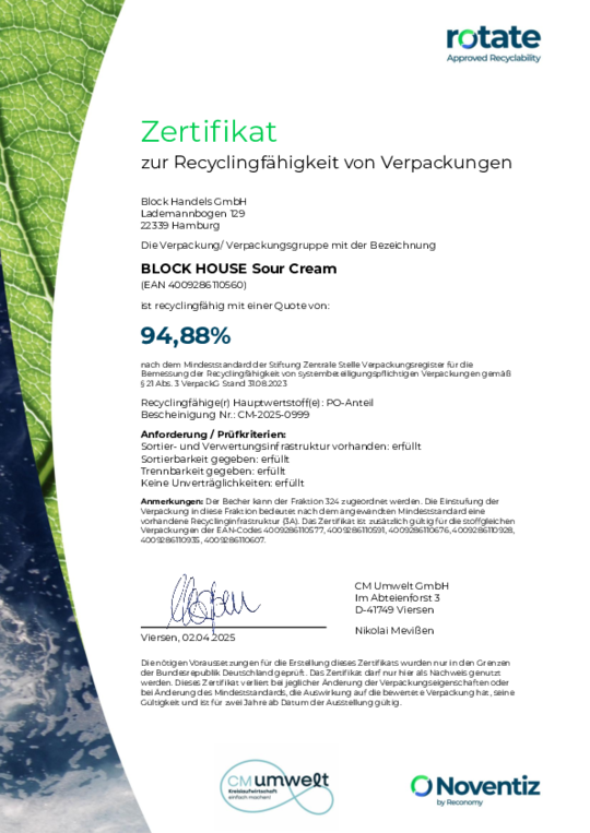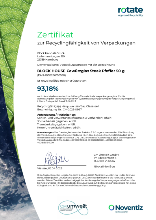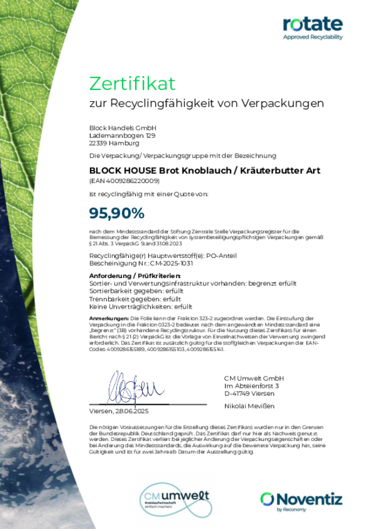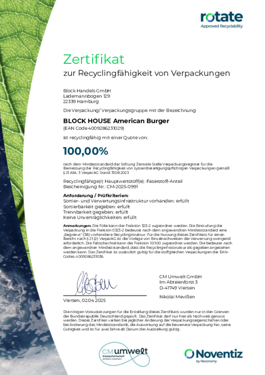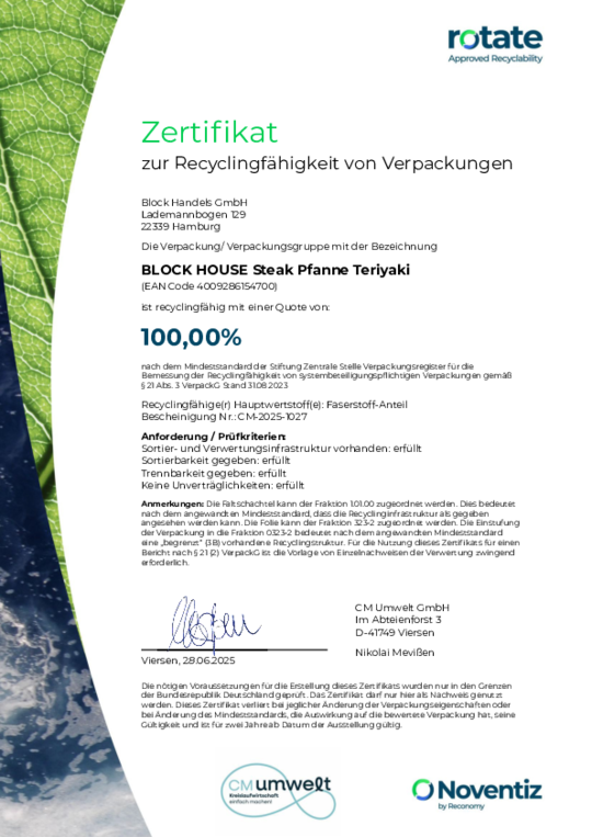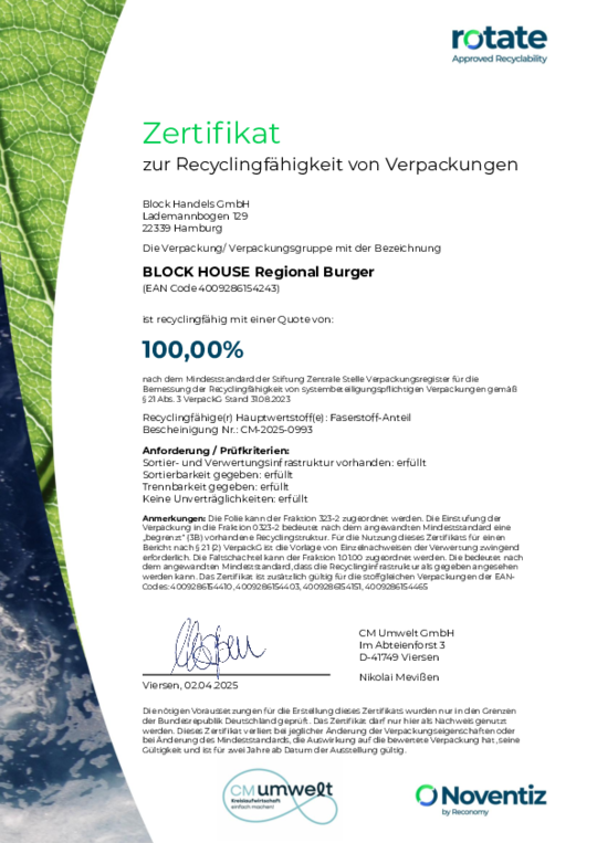 Bei BLOCK HOUSE arbeiten wir kontinuierlich an der Verbesserung unserer Verpackungen. Damit unsere Nachhaltigkeits-Bemühungen transparent und messbar sind, lassen wir diese regelmäßig zertifizieren. Die anerkannte Prüfmethode des Recyclinglabels "rotate" orientiert sich an den Vorgaben der Stiftung Zentrale Stelle Verpackungsregister.