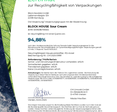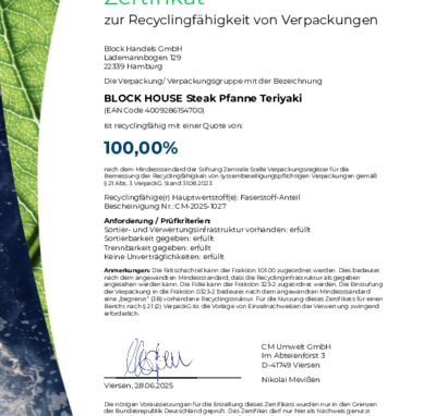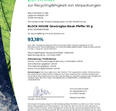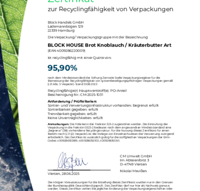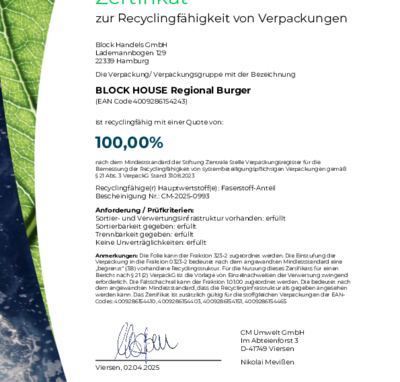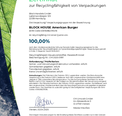 Bei BLOCK HOUSE arbeiten wir kontinuierlich an der Verbesserung unserer Verpackungen. Damit unsere Nachhaltigkeits-Bemühungen transparent und messbar sind, lassen wir diese regelmäßig zertifizieren. Die anerkannte Prüfmethode des Recyclinglabels "rotate" orientiert sich an den Vorgaben der Stiftung Zentrale Stelle Verpackungsregister.